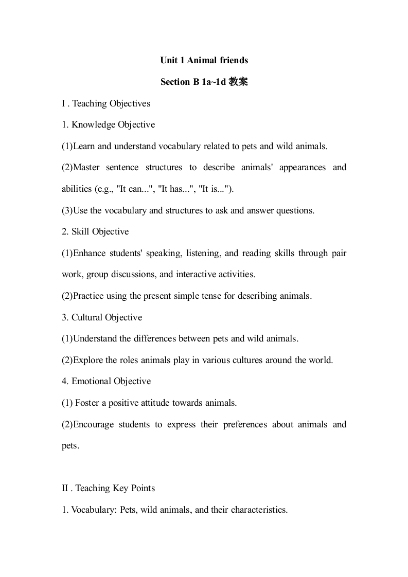 首页英语教案设计七上Unit 1 Animal friends Section B 1a~1d教案2024-2025学年人教版(2024)七年级英语下册