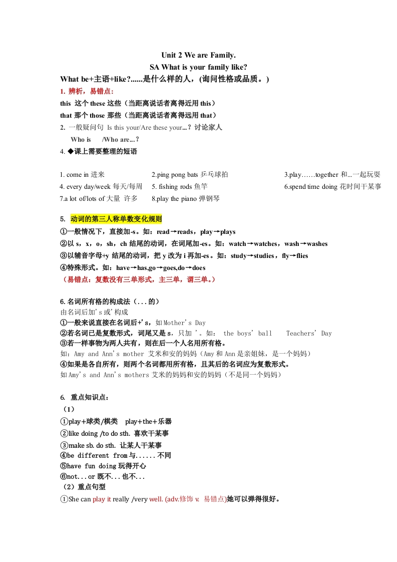 Unit 2 We are Family sectionA 知识点梳理-2024-2025学年人教版英语七年级上册_47347391