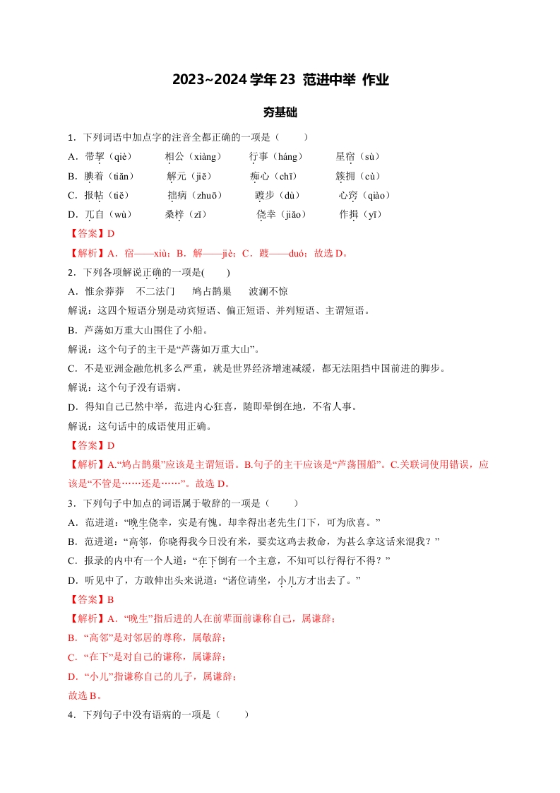 首页语文课时单元卷九上23 范进中举 作业1 部编版九年级上册同步练习