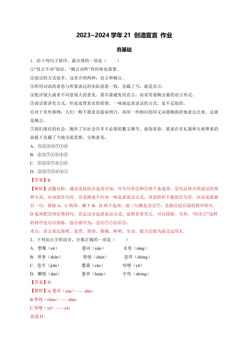 首页语文课时单元卷九上21 创造宣言 作业1 部编版九年级上册同步练习