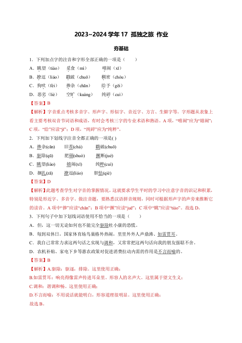 17 孤独之旅 作业1 部编版九年级上册同步练习