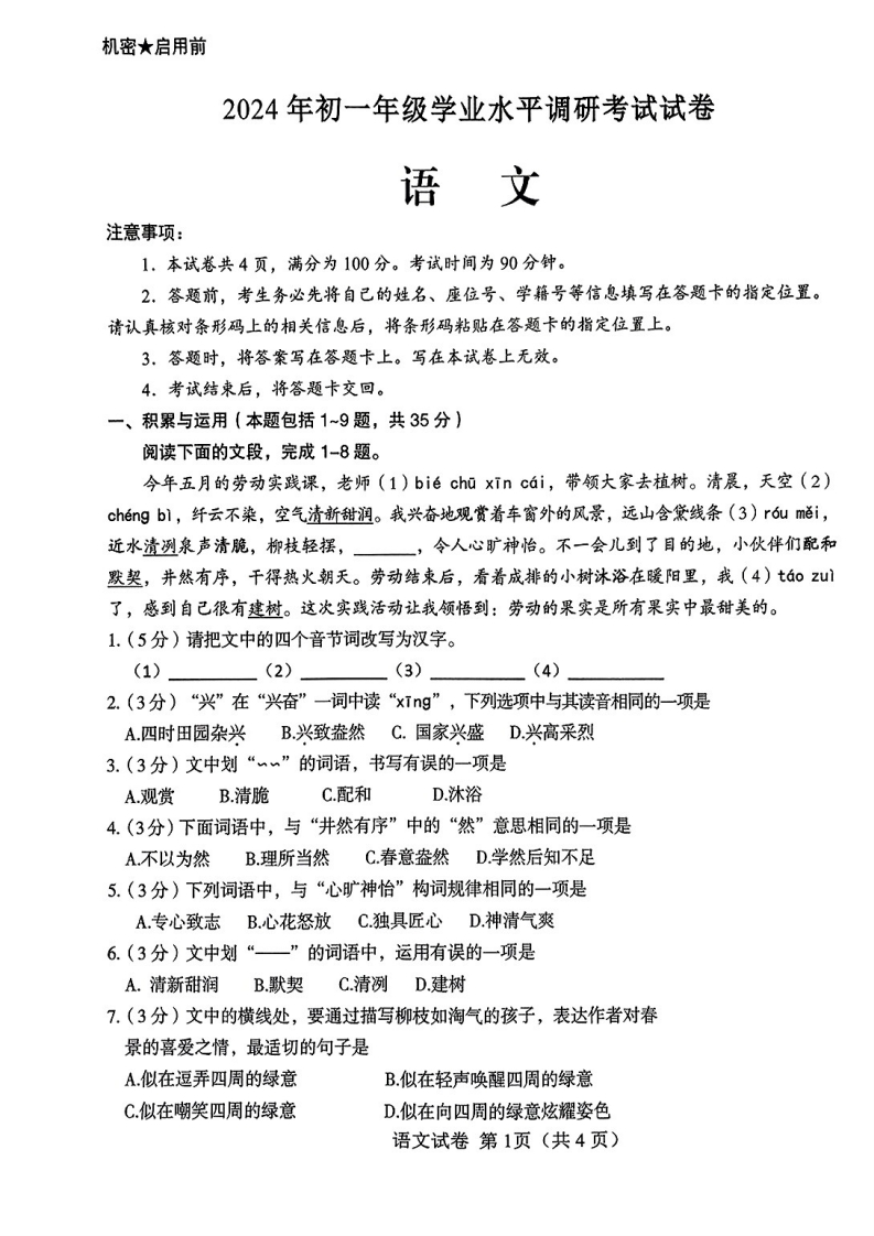 内蒙古呼和浩特市部分学校2024—2025学年七年级上学期开学考试语文题