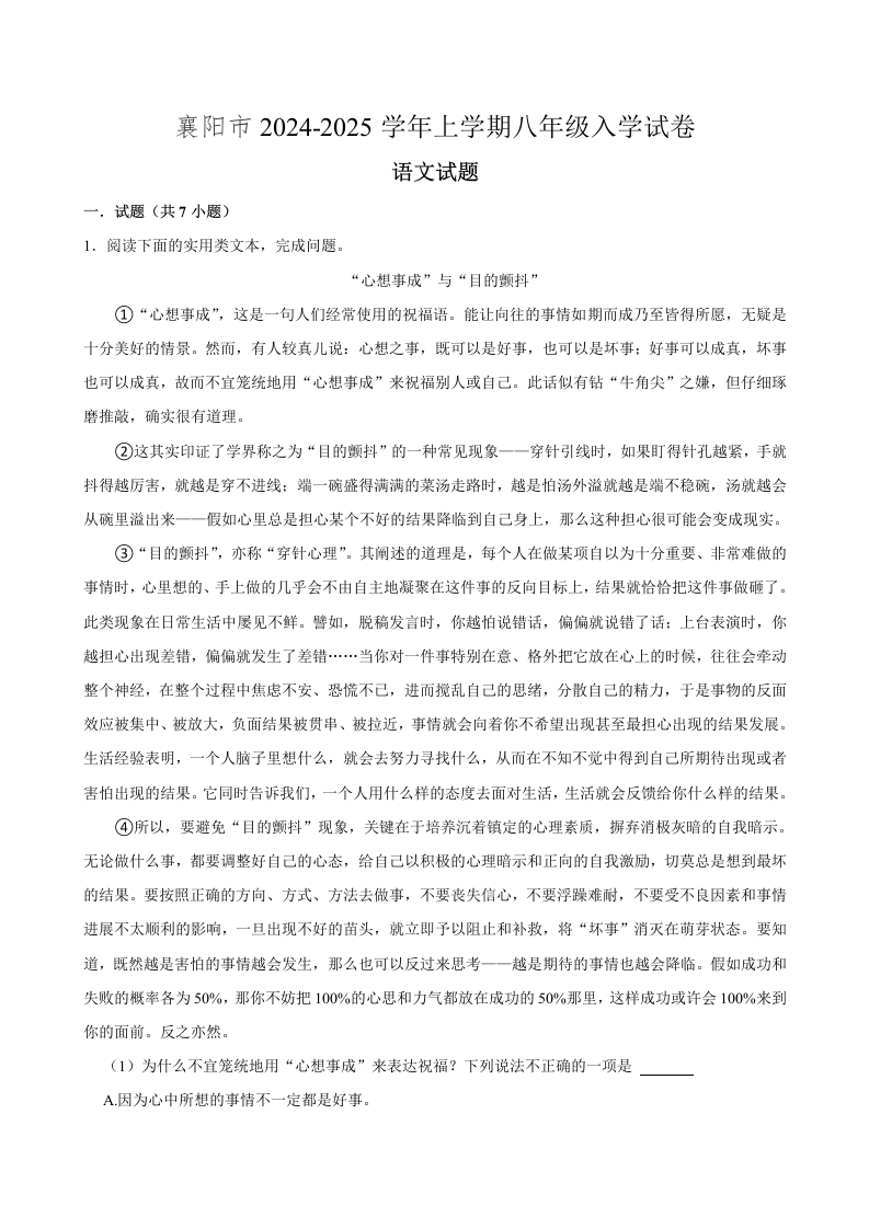 湖北省襄阳市2024-2025学年上学期八年级 语文入学检测试卷(含解析)