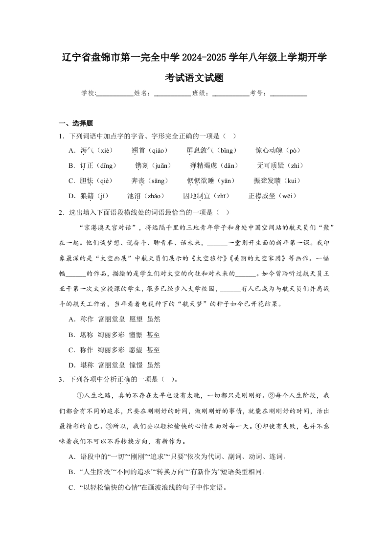 辽宁省盘锦市第一完全中学2024-2025学年八年级上学期开学考试 语文试题(含解析)