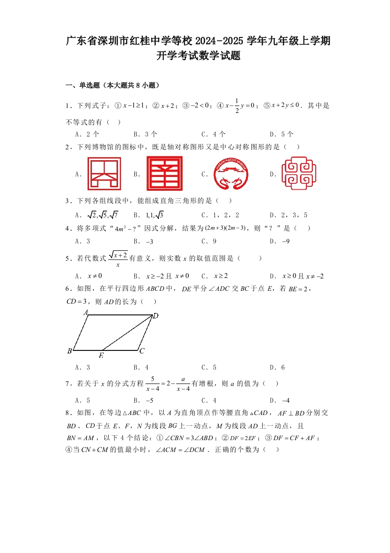 首页数学开学卷九年级广东省深圳市红桂中学等校2024−2025学年九年级上学期开学考试 数学试题(含解析)